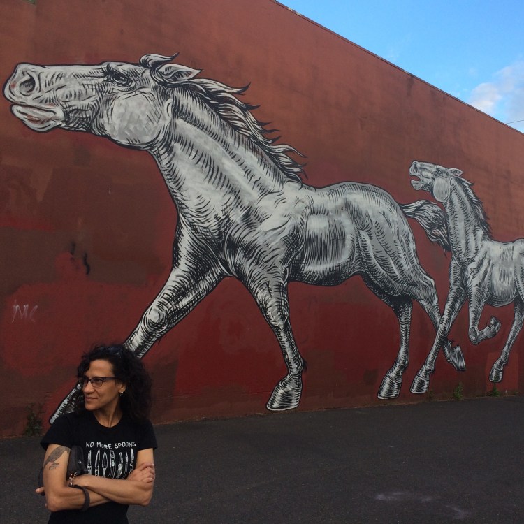 Cheryl is a white Ashkenazi Jewish woman with olive complexion, super cute glasses, and long, dark curly that seems to melt right into her black t-shirt. She’s unaware her picture is being snapped as she stands in front of an enormous mural of running wild horses. She stares wistfully past her shoulder in the direction the painted horses are running. Their black, gray, and white painted lines mirror the white screen print on her t-shirt of a delightful array of sharp knives and daggers and the words “No More Spoons.” A solemn crow tattoo adorns her upper arm, and her forearms are crossed in front of her, chiseled from too many years of typing too much. The air smells of car fumes and evergreen trees on this near-cloudless day.