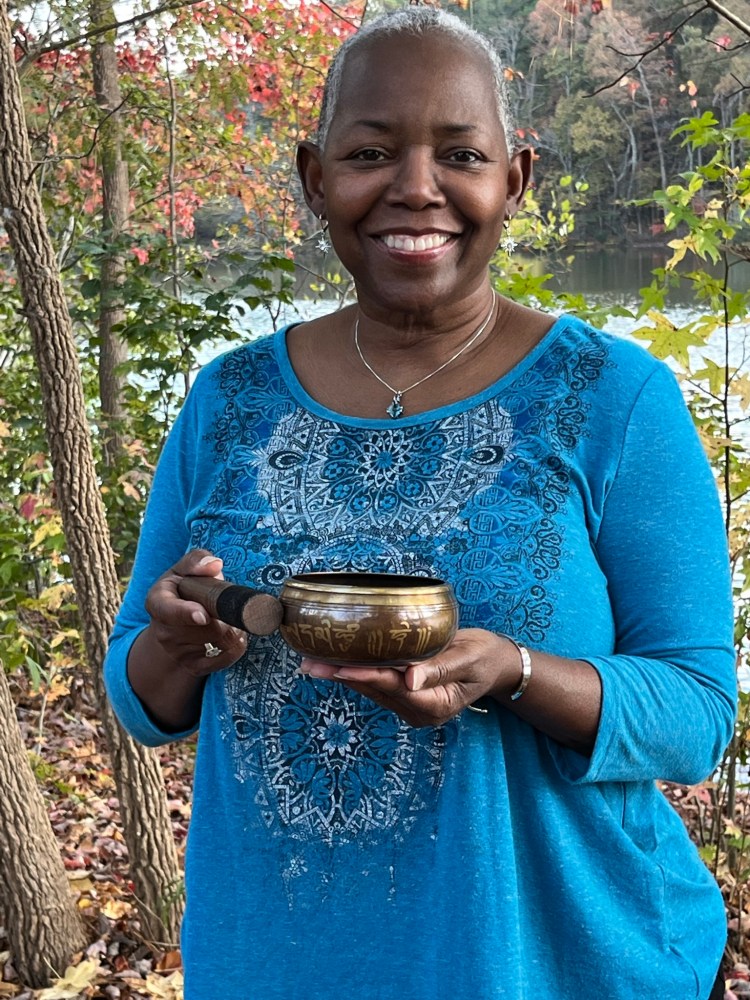 Barbara is a middle-aged pecan brown colored African American woman with close cropped salt and pepper natural hair. She smiles widely as she stands holding a Tibetan singing bowl and mallet in front of a lake with a backdrop of trees in fall colors of green, gold and crimson. Barbara wears a royal blue top with multiple mandalas and sacred geometry images imprinted in white and black, a silver chain with an aquamarine stone and clear, small dangling earrings that look like sparkling stars.