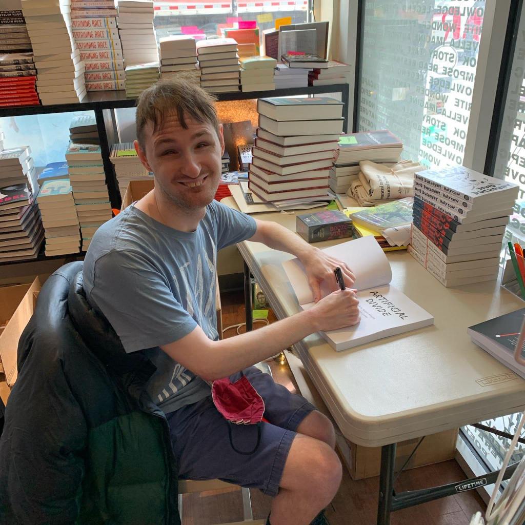 In this picture, you see me signing one of my books in a bookstore. I’m a pale white male with dirty blonde hair, and in the picture, I am smiling very impishly and a tad coquettishly.