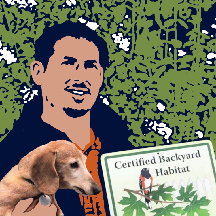 The head of the tiny dog appears in profile–a floppy eared, light brown dachshund with a pointy snout that has turned white with age. The metal placard toward which she is facing is about the size of a record album. Across the top it reads “Certified Backyard Habitat” in elegant type. A naturalistic color drawing below shows a songbird on a slender branch with large, green, multi-lobed leaves dangling around it. The caramel waistcoat and white wing marks are those of a spotted towhee, and the size and shape of the leaves are of an Oregon maple.